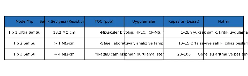 Tablo Açıklaması: Model/Tip | Saflık Seviyesi (Resistivite) | TOC (ppb) | Uygulamalar | Kapasite (L/saat) | Notlar. Bu tablo, farklı saflık seviyelerinin tipik parametrelerini karşılaştırarak hangi modelin hangi uygulamalar için uygun olduğunu gösterir.