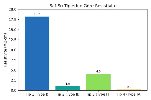 Saf su tiplerinin resistivite değerleri, ihtiyaç duyulan uygulamaya uygun cihazın seçilmesinde önemli rol oynar. Aşağıdaki grafik, dört temel saflık tipinin teorik resistivite değerlerini gösterir. 18,2 MΩ·cm seviyesindeki Tip 1 su, iyon içeriği en düşük olan sudur. Tip 2, 1 MΩ·cm ile genel laboratuvar ihtiyaçlarını karşılar. Tip 3 su yaklaşık 4 MΩ·cm resistiviteye sahiptir; bu seviye cam malzeme durulama veya otoklav beslemesi gibi uygulamalar için yeterlidir. Tip 4 su ise 0,2 MΩ·cm civarında resistiviteyle endüstriyel arıtma sistemlerinin ön beslemesinde kullanılır. Bu eğilim, saflık arttıkça resistivitenin logaritmik olarak yükseldiğini gösterir.