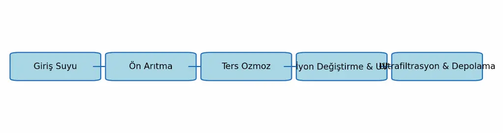 Şema Açıklaması: Girdi → Ön arıtma (sediment ve aktif karbon) → Ters ozmoz → İyon değişimi & UV oksidasyon → Ultrafiltrasyon & depolama. Bu akış, kirleticilerin ardışık olarak elimine edilmesini sağlar.